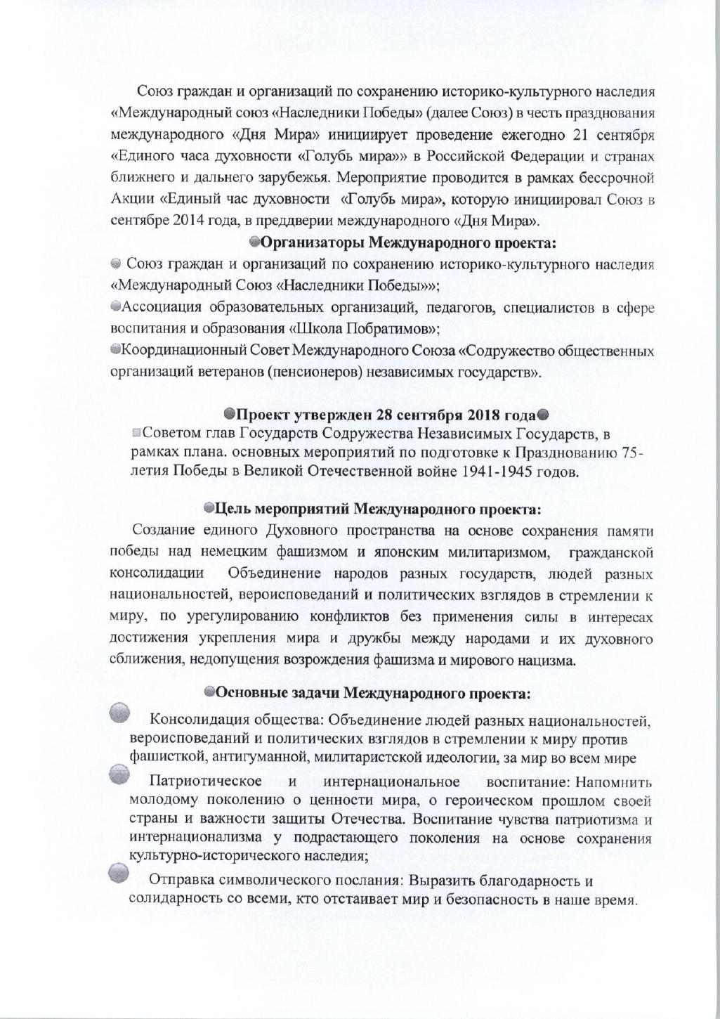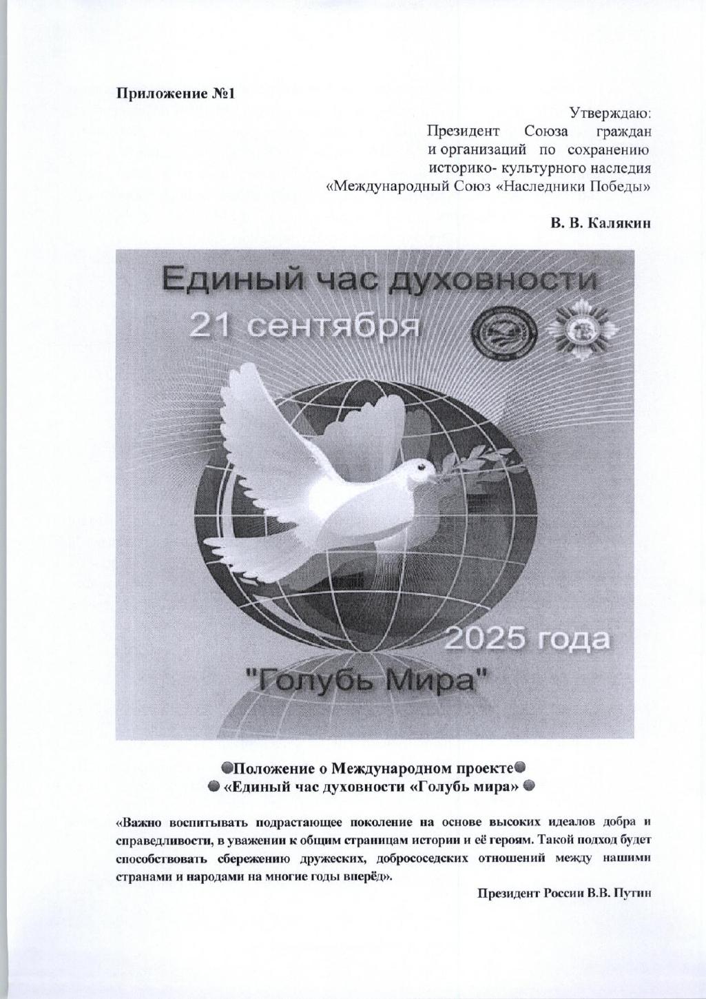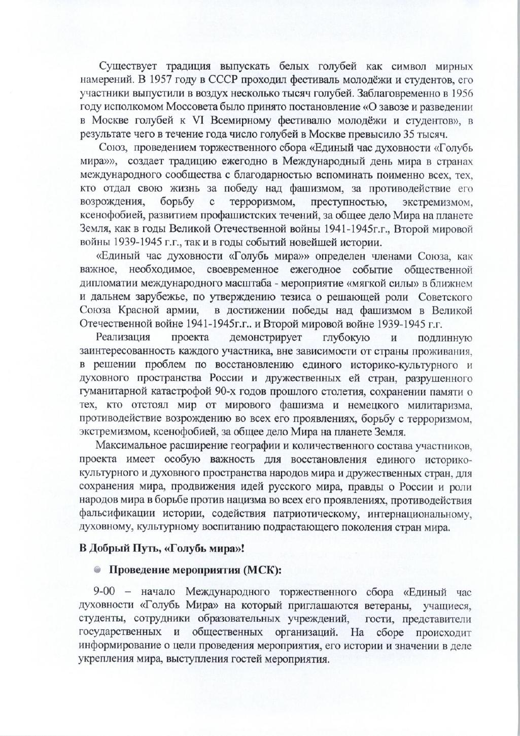 Торжественный сбор «Единый час духовности «Голубь Мира» с каждым годом расширяет свои границы как в России, так и в других странах зарубежья. Гражданское общество стран мира оценивает его как важное событие народной дипломатии международного масштаба, позволяющее еще раз подчеркнуть